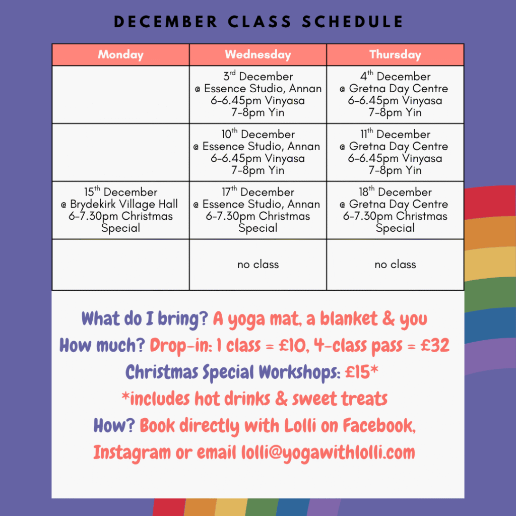 Regular Yin yoga classes for November have now been scheduled and can be booked. Please email lolli@yogawithlolli.com or message on Facebook or Instagram to secure your place. I have added Vinyasa flow classes to Annan and Gretna at 6pm-6.45pm with the Yin class following after from 7-8pm.