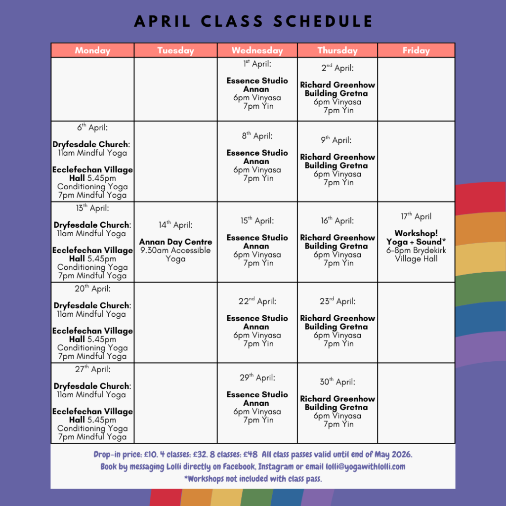 I’m really happy with how the Ecclefechan and Lockerbie classes are going, and a big thank you for everyone who has put their trust in a new teacher and a slightly different yoga direction. I hope you’re enjoying it!