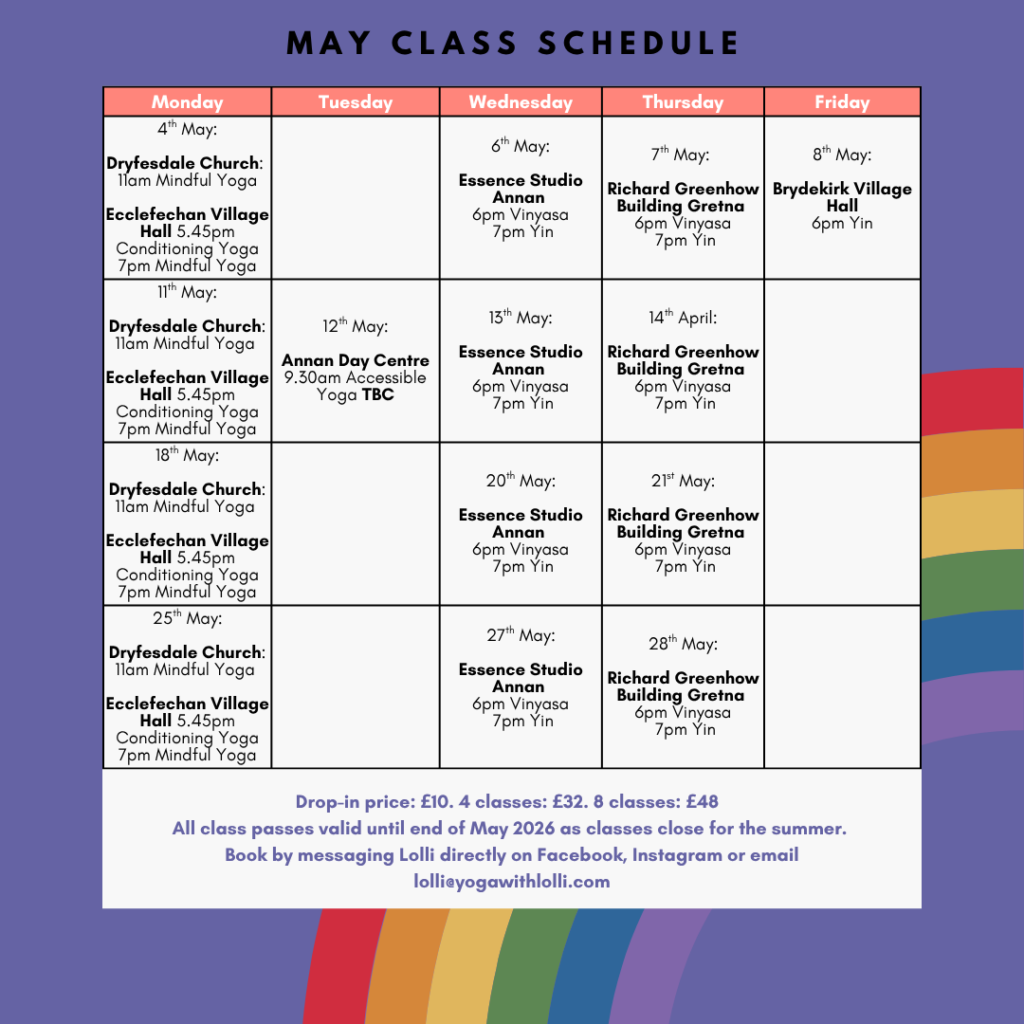Accessible Yoga is back for one more class before the summer and it is free! In May, you can join any one movement class for free at the Annan Day Centre (click here to find out more!) and most classes are £3 anyway! They have Tai Chi, chair Pilates, line dancing and all sorts. If you or someone you know would benefit from the movement and the social community, let them know!